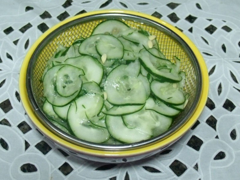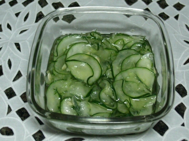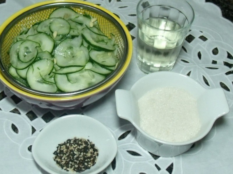 Lavar bem o pepino, descartar as pontas e cortar em fatias bem finas com uma faca amolada ou um cortador de legumes. Colocar em uma peneira com sal por 30 minutos para desidratar. Lavar em água corrente para retirar o excesso de sal e reservar em um recipiente com tampa. Levar uma panela ao fogo baixo com o açúcar e o vinagre até ferver. Retirar do fogo e deixar esfriar. Acrescentar esse líquido frio sobre o pepino até cobrir e levar à geladeira por 12 h. Servir com sashimi de salmão e Kani-Kama (cortar em cubos pequenos) e polvilhar com gergelim ou servir à parte.