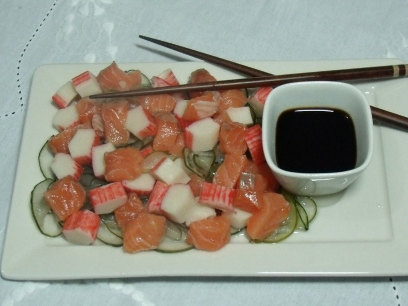 Sunomono é uma típica salada da culinária japonesa, tendo como base o pepino japonês, vinagre de arroz e açúcar. Adoro sair com amigos para saborear um gostoso Sunomono com salmão, polvo e Kani-Kama. Hoje resolvi preparar em casa. E não é que saiu igualzinho aos famosos de Maceió? Infelizmente eu não tinha polvo, mas no próximo ele não faltará!