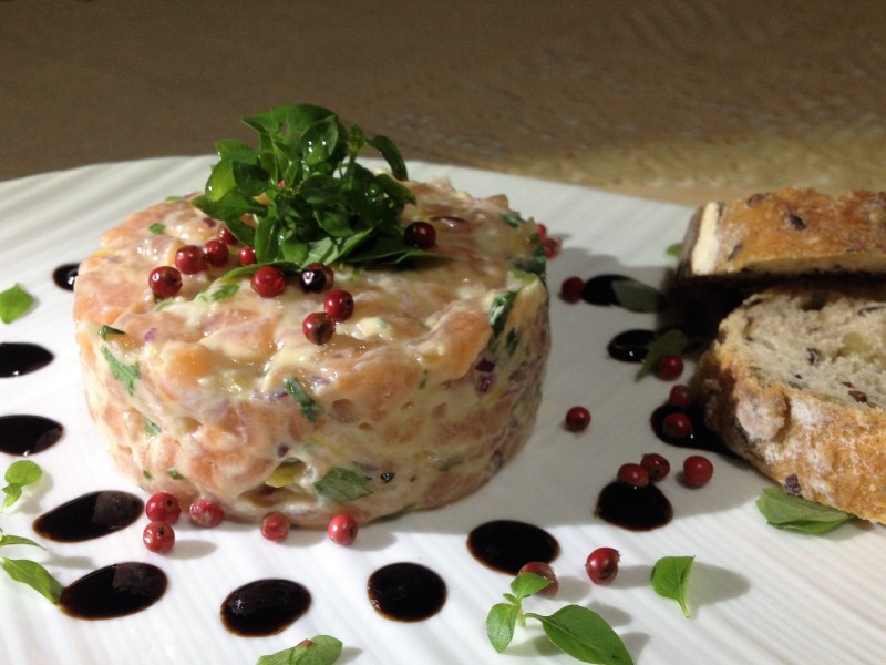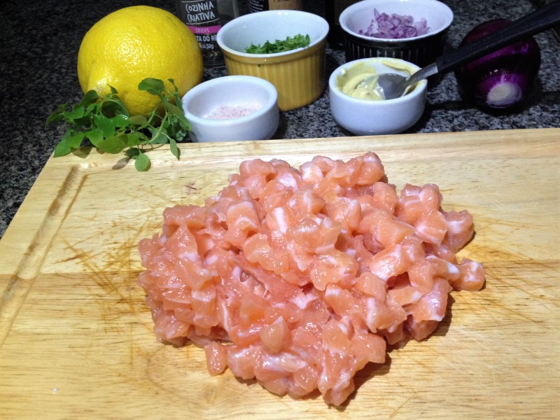 Limpar bem o salmão, retirar a pele e a parte preta. Cortar em tirinhas e depois em cubinhos bem pequenos. Colocar em um recipiente e acrescentar a cebola roxa, o coentro, o azeite, o suco e as raspas do limão, a mostarda e a maionese. Temperar com o sal e a pimenta-do-reino e misturar bem. Utilizar um aro sobre o prato que vai servir, colocar dentro o Tartar e retirar o aro com cuidado. Por cima, dispor algumas pimentas rosas e uns raminhos de mini-manjericão. Decorar com redução de balsâmico, pimentas rosas e folhinhas de mini-manjericão. Servir com torradas de sua preferência.