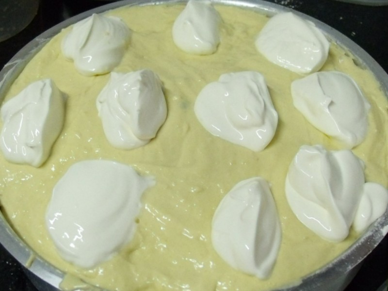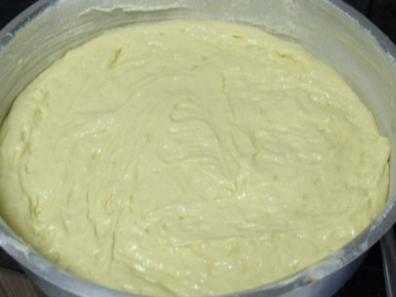 Bater tudo no liquidificador (menos o fermento). Adicionar o fermento e misturar bem.