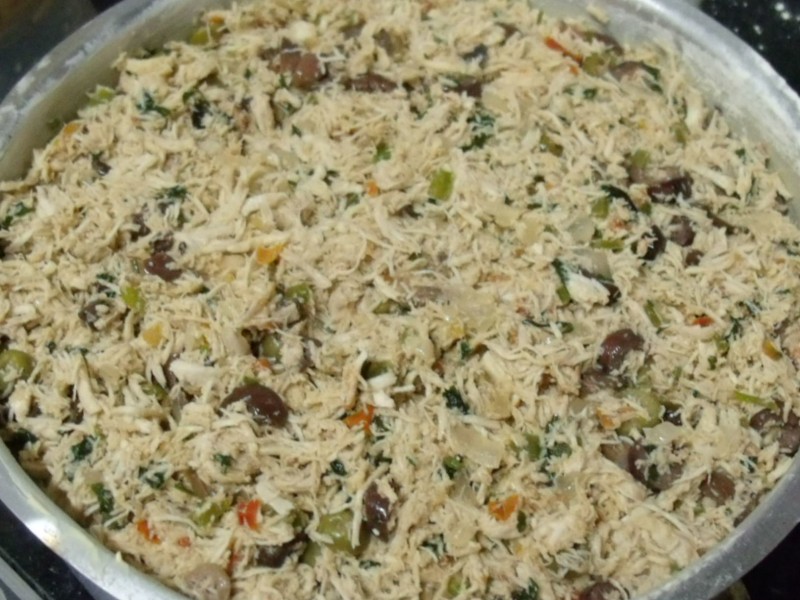 Refogar o alho e a cebola no azeite, depois o pimentão (opcional), colorau e sal a gosto. Acrescentar o frango desfiado, o tomate e as azeitonas. Reservar.