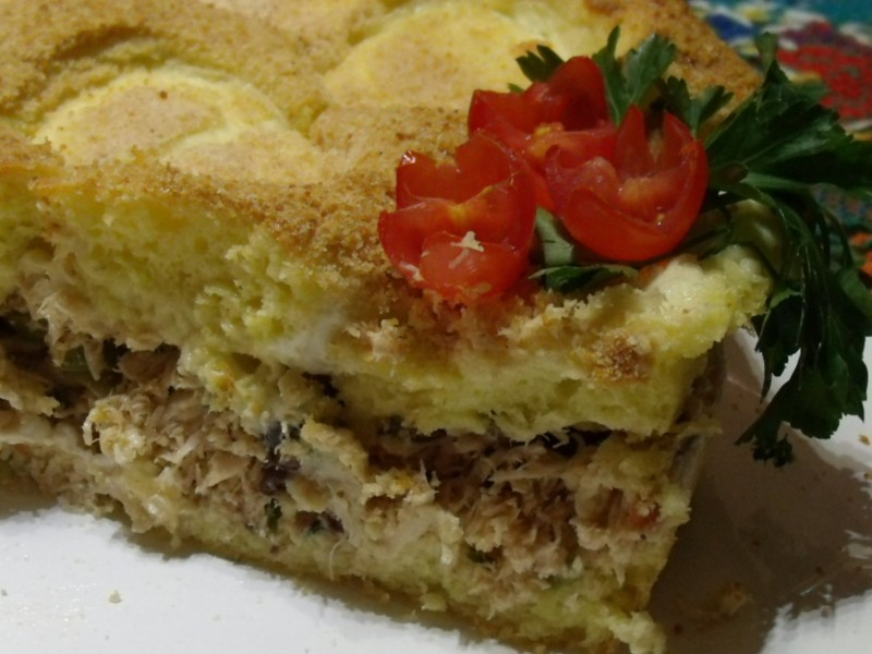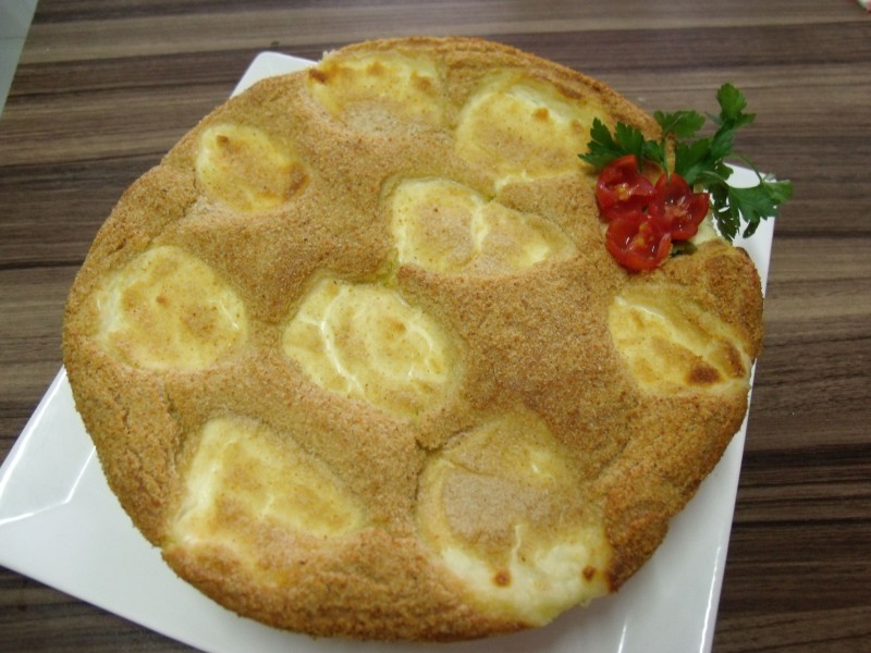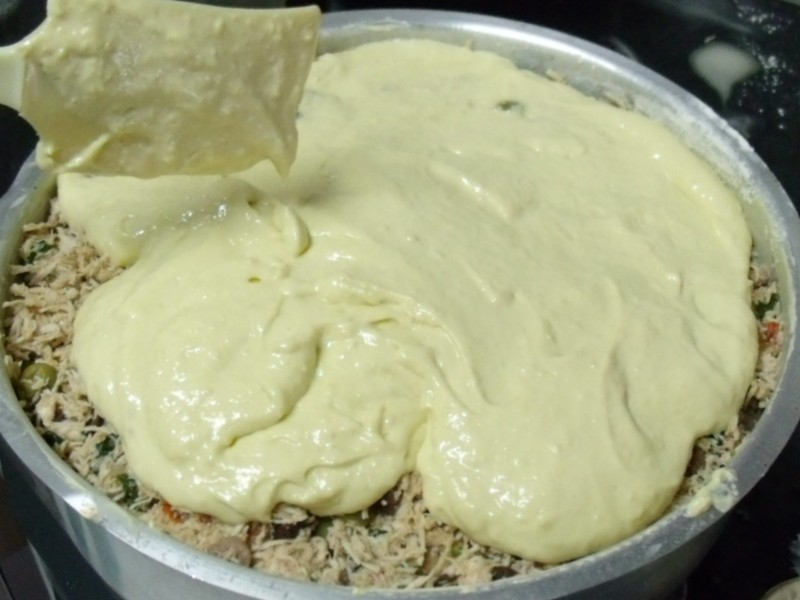 Untar uma fôrma com manteiga e polvilhar com farinha de rosca. Cobrir o fundo com a metade da massa, colocar o recheio e por cima a outra metade da massa. Espalhar o requeijão e polvilhar fartamente a farinha de rosca. Assar em forno preaquecido a 200 graus por 20 a 30 minutos. Decorar com galhos de salsa e flores de tomate.