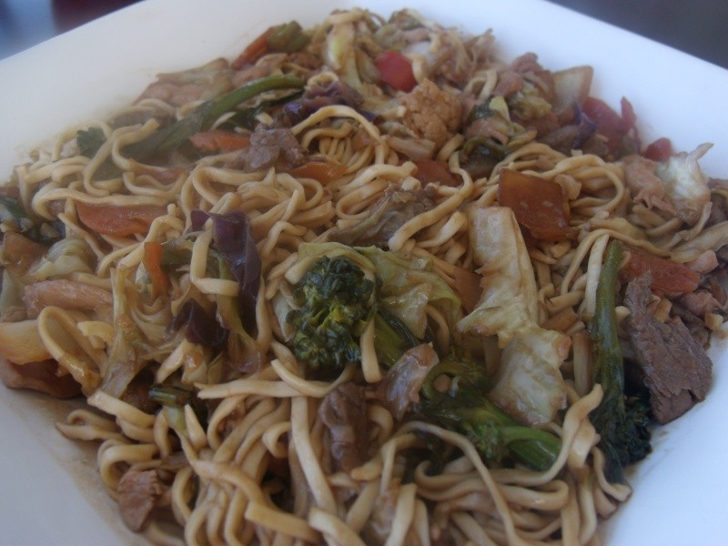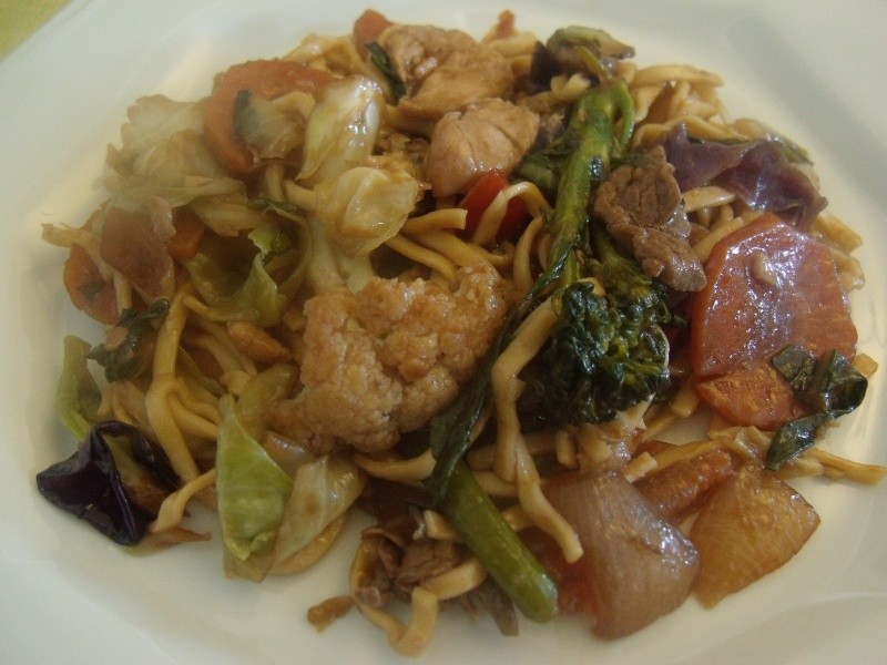 Nota: Cortar as carnes em bifes finos para depois cortá-las em tiras largas como mencionado acima. O macarrão pré-cozido pode ser substituído pelo de pacote, cozinhado normalmente em água e sal, devendo ficar “al dente”.